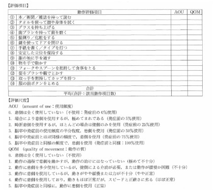 (参考:高橋香代子ら.新しい上肢運動機能評価法・日本語版Motor Activity Logの信頼性と妥当性の検討. 2009, 作業療法, 8: p628-636)