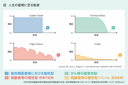 日本医師会が示す「人生の最期に至る軌跡(図2)」にもあるように、人によって人生の最期に至る軌跡は大きく異なります。がんのように短期間で急激に状態変化をもたらす場合もあれば、フレイルのようにゆっくりと最期を迎える場合もあります。